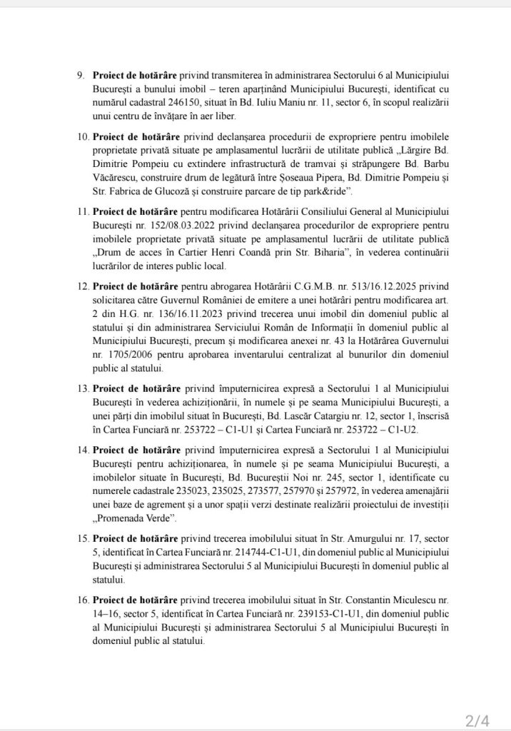 - Proiect de hotărâre pentru abrogarea Hotărârii C.G.M.B. nr. 513/16.12.2025 privind solicitarea către Guvernul României de emitere a unei hotărâri pentru modificarea art. 2 din H.G. nr. 136/16.11.2023 privind trecerea unui imobil din domeniul public al statului și din administrarea Serviciului Român de Informații în domeniul public al Municipiului București, precum și modificarea anexei nr. 43 la Hotărârea Guvernului nr. 1705/2006 pentru aprobarea inventarului centralizat al bunurilor din domeniul public al statului.