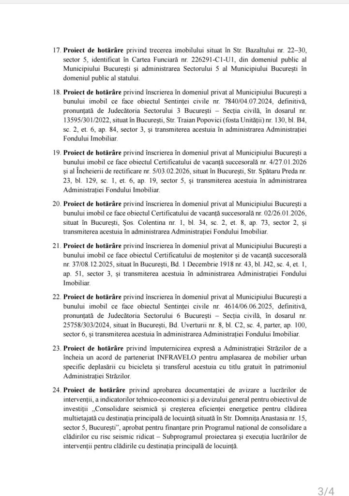 - Proiect de hotărâre privind înscrierea în domeniul privat al Municipiului București a bunului imobil ce face obiectul Certificatului de vacanță succesorală nr. 4/27.01.2026 și al Încheierii de rectificare nr. 5/03.02.2026, situat în București, Str. Spătaru Preda nr. 23, bl. 129, sc. 1, et. 6, ap. 19, sector 5, și transmiterea acestuia în administrarea Administrației Fondului Imobiliar.