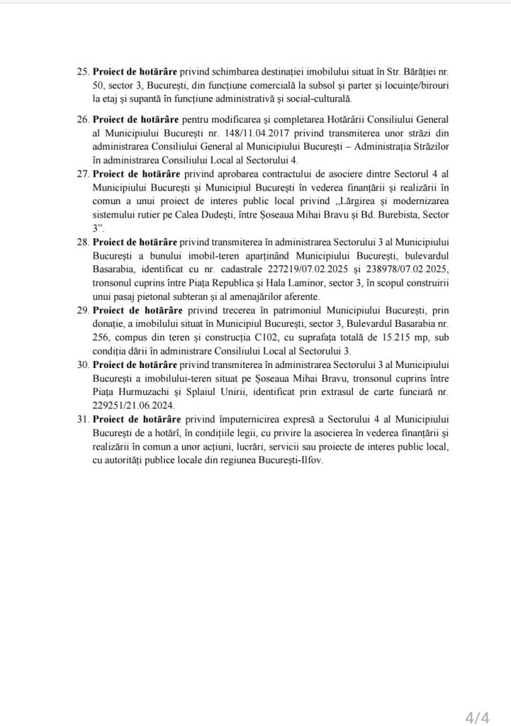 - Proiect de hotărâre pentru modificarea și completarea Hotărârii Consiliului General al Municipiului București nr. 148/11.04.2017 privind transmiterea unor străzi din administrarea Consiliului General al Municipiului București – Administrația Străzilor în administrarea Consiliului Local al Sectorului 4.