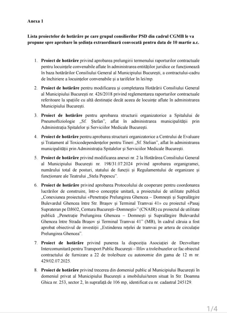 Lista proiectelor de hotărâre pe care grupul consilierilor PSD din cadrul CGMB le va propune spre aprobare în ședința extraordinară convocată pentru data de 10 martie a.c.