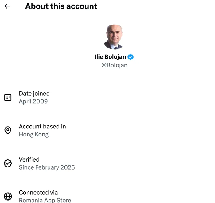 Jurnalistul Patrick André de Hillerin a fost cel care a postat pe pagina sa de Facebook: „X (ex-Twitter), a început să afișeze țara în care este atribuit fiecare cont. Prostălăul sau prostălăii care lucrează pentru Ilie Bolojan, premierul României, au făcut în așa fel încât contul de X al lui Bolojan apare ca fiind bazat în Hong Kong.